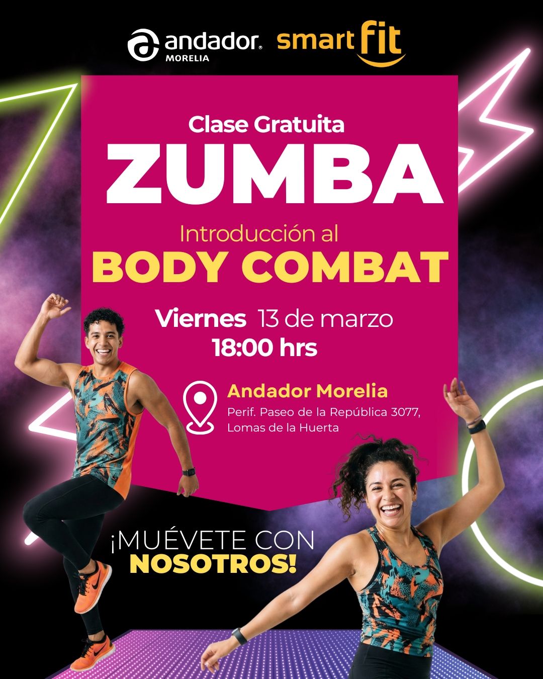 Este sábado 25 de octubre a las 10:00 a.m., Andador Morelia y Smart Fit te invitan a una sesión gratuita de ZUMBA abierta a todo el público. Además, tendremos una sesión intermedia de Body Combat.